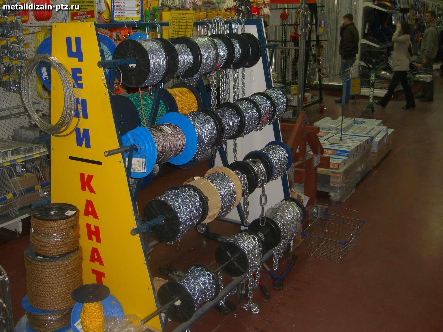 Стойка для хранения и продажи цепей, канатов и тросов. Удобство ее в том, что не требуется снимать бабину со стойки при отмере товара. |